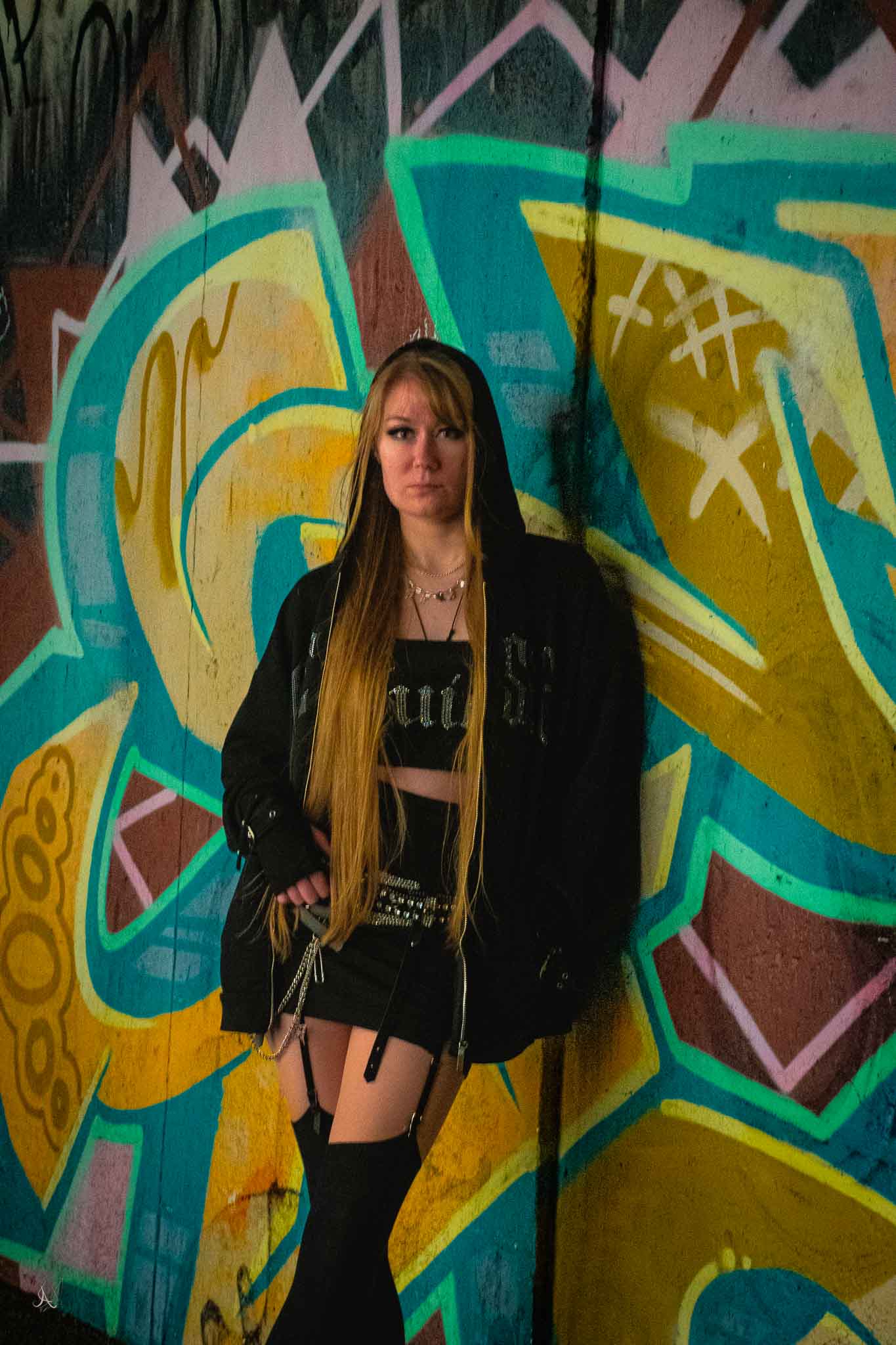 Working with my flash I captured her in pensive and strong poses to evoke a confidence. This style has a hard edge from the complete black clothes to the bright and chaotic graffiti. So I wanted to put a focus on that hard edge in her mood and pose as well