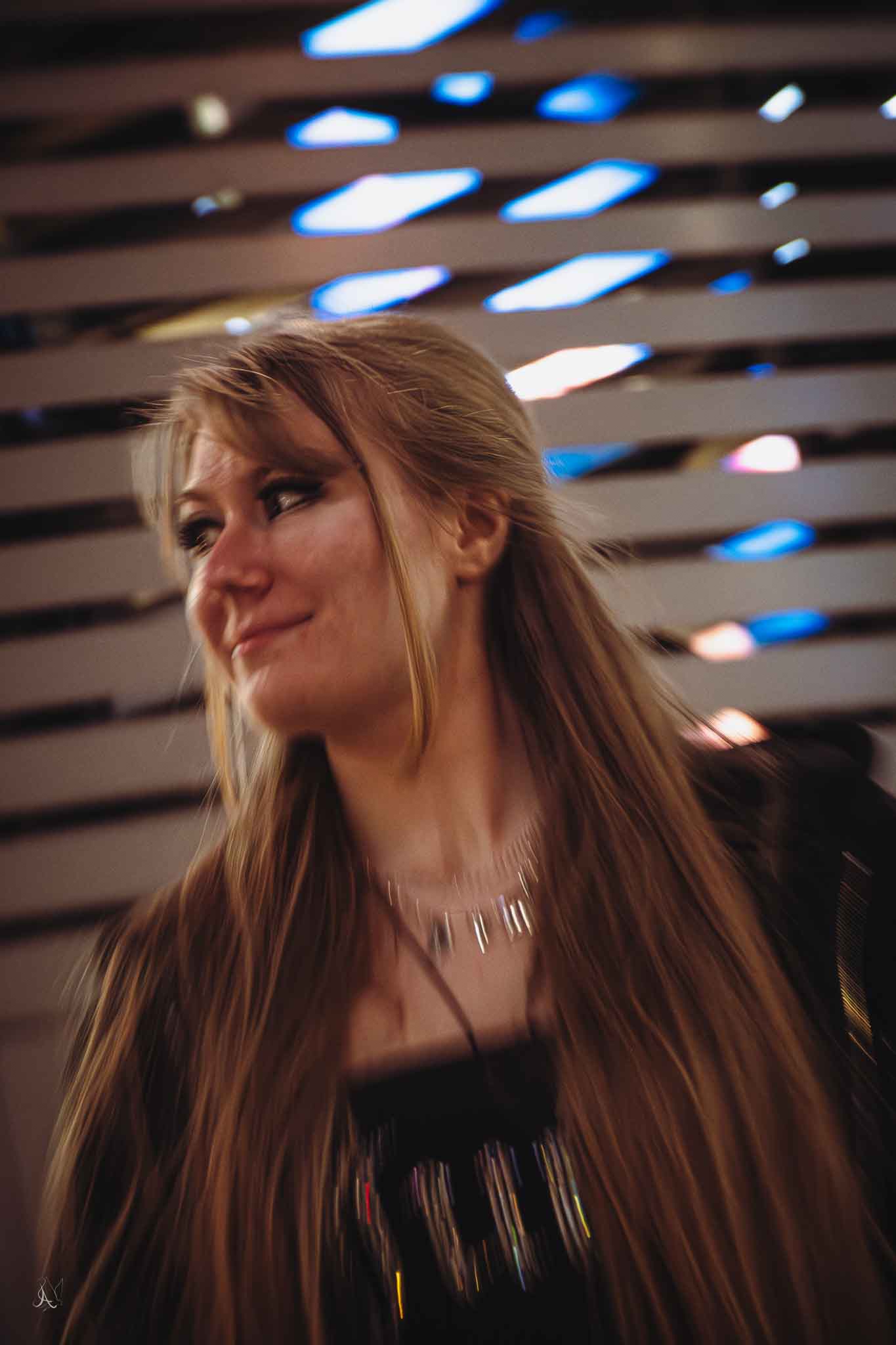 The alleyways around the plaza were covered with the scrawling lines of its citizens. Bright neon lights lit the paths below the rails. Playing with poses and color I focused the subject with a harsh shadow and details in the hair. I think I prefer the purple for the way that it highlights the yellow of the hair, giving the photo a golden hue.