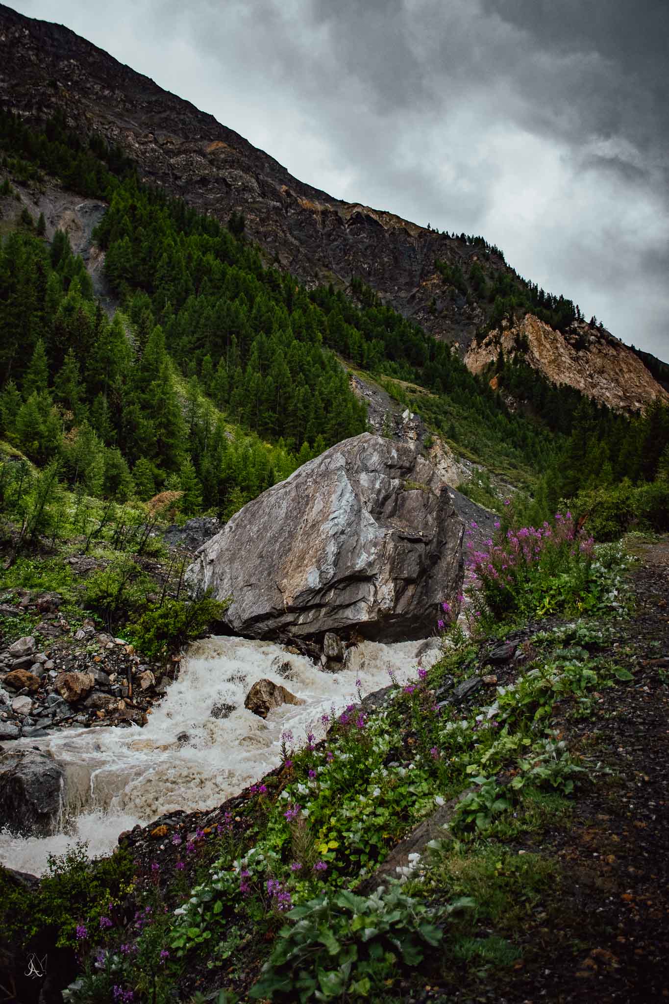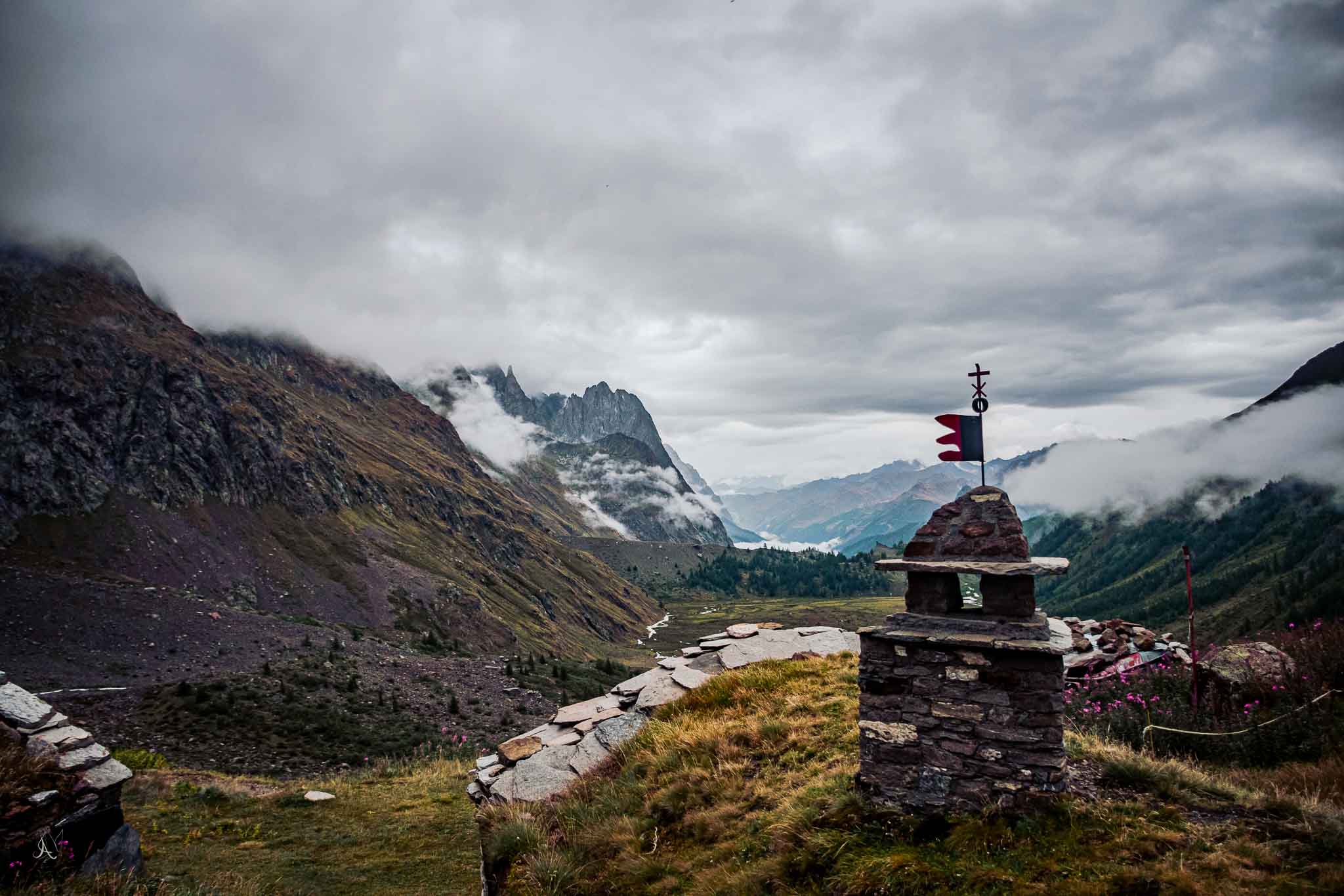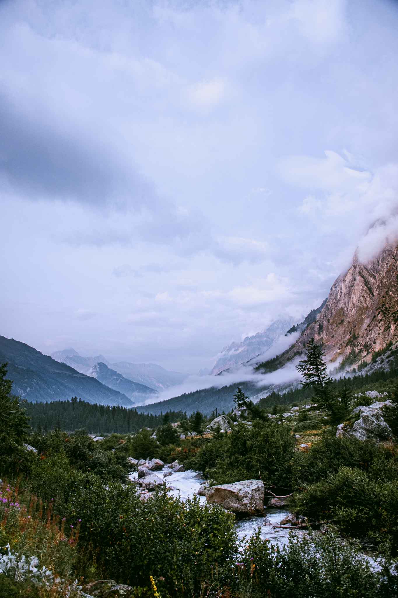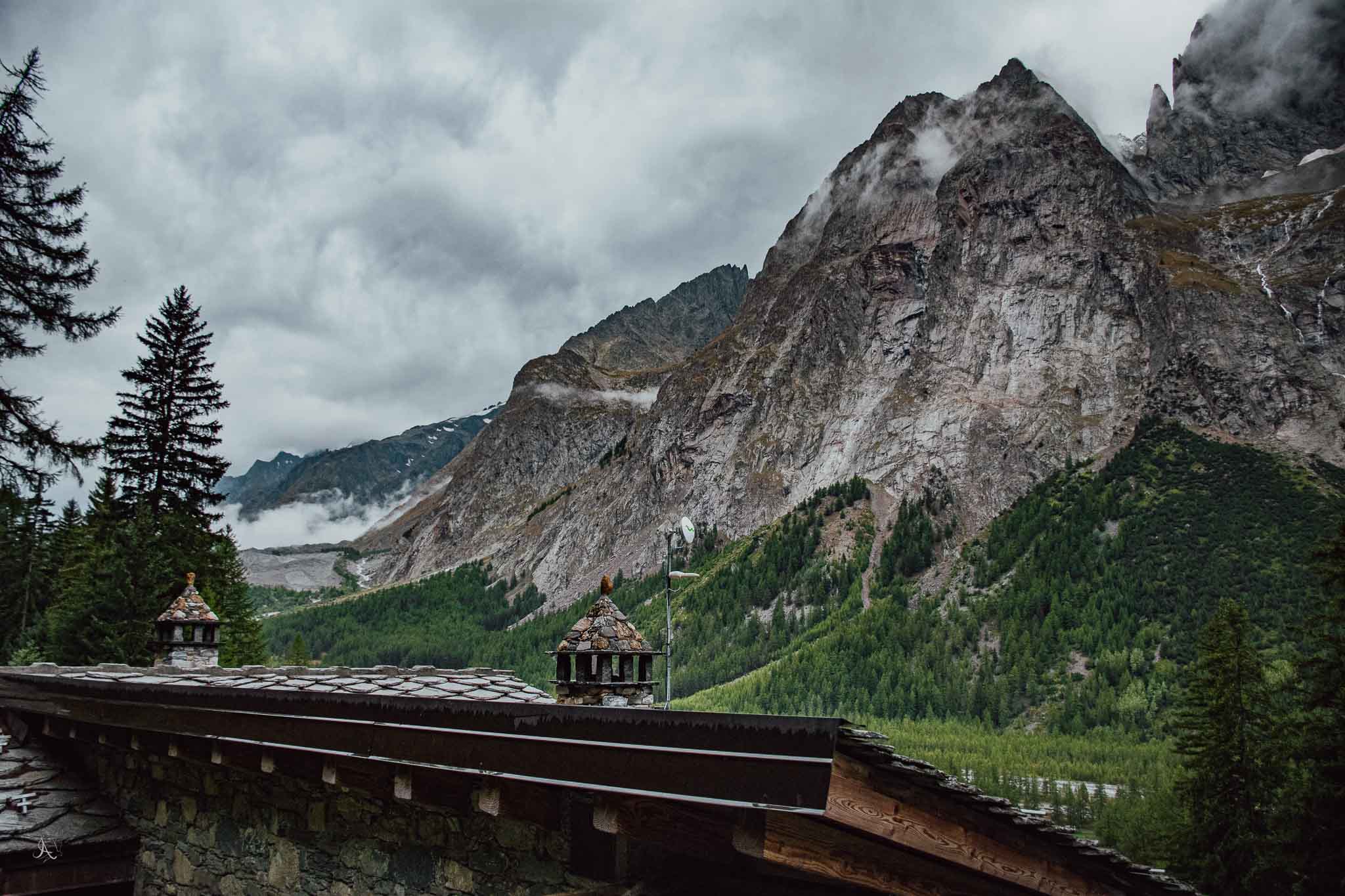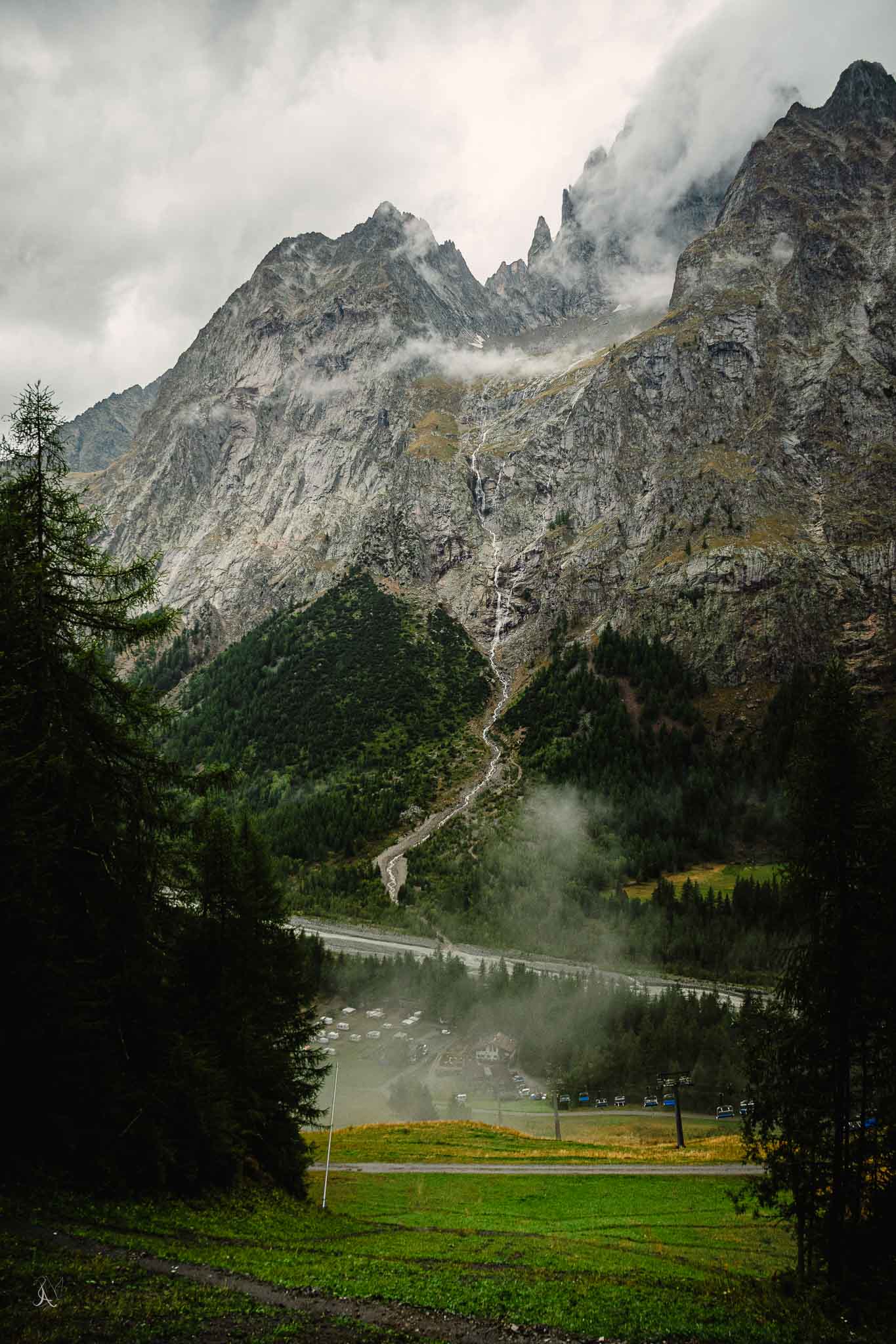 We walked down the valley following the river to our next destination, Courmayeur. We awoke to a misty sky and the air humid and stormy. The Mountains covered and peaking through the clouds made for the perfect background to hike to